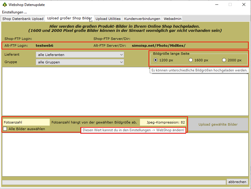 Hersteller und Wiederverkäufer, die Ihre großen Produktbilder zu Download anbieten wollen, können die Simoart Bilder in großer Auflösung mit folgendem Programm hochladen. Das Hochladen der Bilder in tiefer Auflösung (600 Pixel) erfolgt, wie immer schon, durch eine "Datenbank Aktualisierung vollständig".