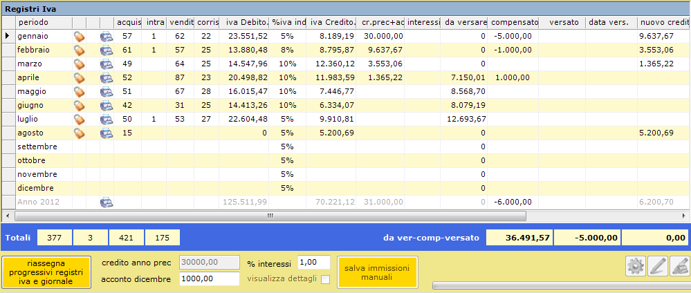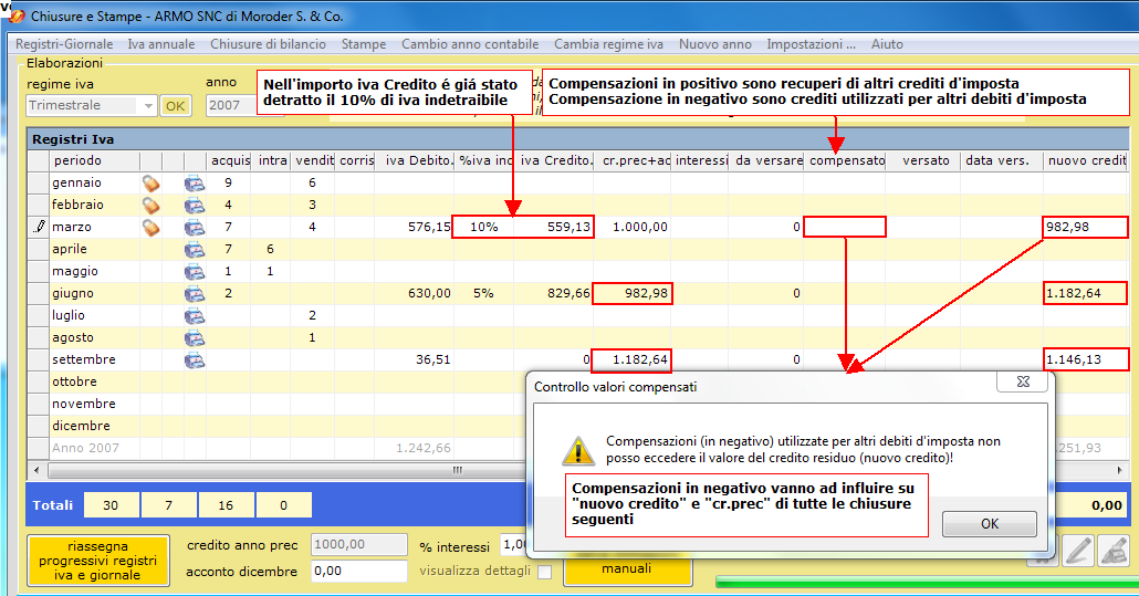Su richiesta, oltre alla gestione delle compensazioni positive (recuperi di altri crediti d'imposta), é stato integrata la gestione delle compensazioni negative (crediti iva utilizzati per altri debiti d'imposta). Questo ultimo tipo di compensazione và ad influire sul nuovo credito da riportare alla liquidazione successiva., quindi deve essere evidenziato nei riepiloghi iva.