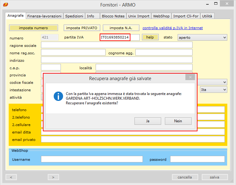 Come campo di controllo viene utilizzata la partita IVA. Quando viene immesso un nuovo Cliente o Fornitore, il sistema controlla le partite IVA già salvate: nel caso esista una corrispondenza, verrà visualizzato il seguente messaggio.