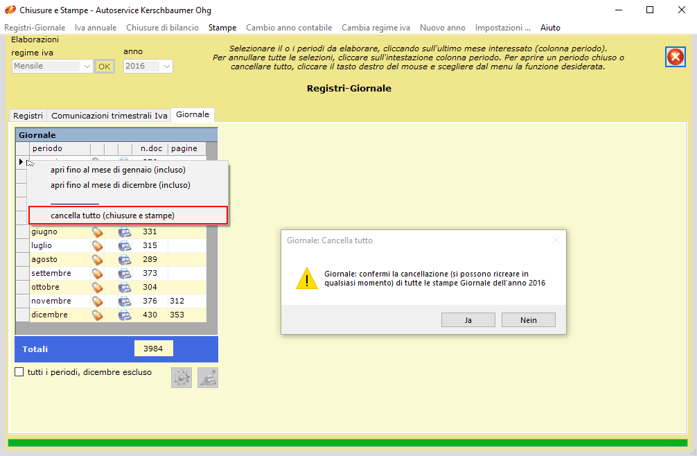 Consiglio: se è già stato stampato un certo periodo, dopo la cancellazione di tutte le stampe Giornale, si ricrei dapprima il periodo già stampato ed invece di stamparlo su carta lo si invii su un PDF. Quindi si crea il periodo voluto e si stampa come di consueto.