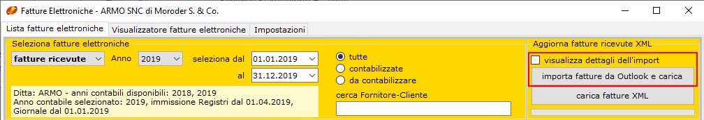 In seguito al buon funzionamento della funzione di import da Outlook delle fatture elettroniche ricevute, la funzione è stata ulteriormente migliorata. Con un solo click ora è possibile importare le fatture dal programma di posta elettronica Outlook e caricarle nel programma pronte per essere visualizzate e contabilizzate.
