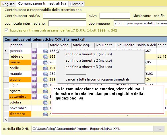 In questa immagine sono state effettuate le liquidazioni mensili da gennaio a dicembre. Fino a settembre sono state effettuate pure le Comunicazioni telematiche.