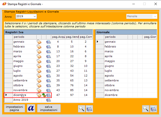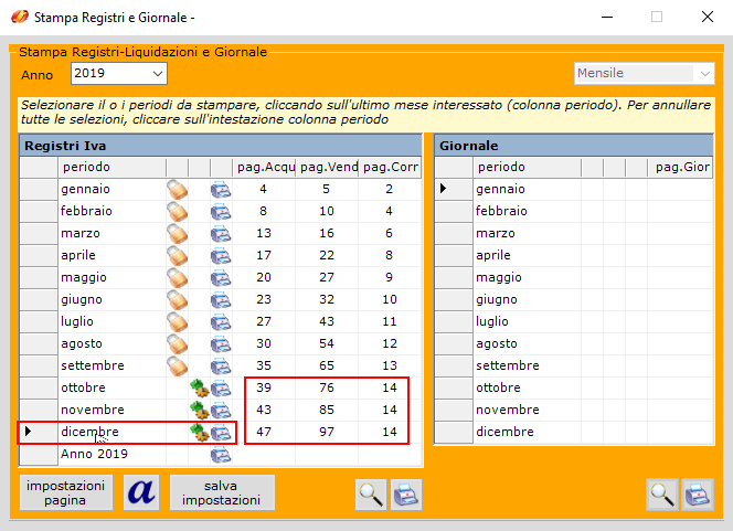 Nel caso specifico, una particolarità avviene nella stampa delle liquidazioni mensili di novembre e dicembre: siccome i mesi a partire da ottobre sono aperti, il programma prepara le stampe a partire da ottobre. Per ovviare di stampare sempre tutti i mesi a partire da ottobre, è stato modificato il programma in modo da stampare solo il mese richiesto. Nell'esempio, cliccando su dicembre, verranno stampati registri e liquidazione del solo mese di dicembre.