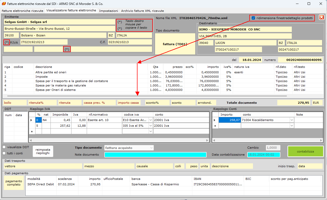 I campi contrassegnati con l'asterisco (*), la regione sociale, l'indirizzo, la partita iva e l'email dell'emittente posso essere copiati nella clipboard usando il tasto destro del mouse sul campo interessato. Inoltre, ora è possibile ridimensionare la sezione righe prodotto cliccando su "ridimensiona finestra dettaglio prodotti" e la sezione Riepilogo IVA semplicemente ingrandendo la finestra del programma.