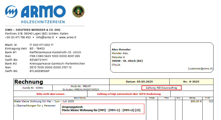 Im Ausdruck der Rechnungen mit RID-SEPA Zahlung wurde der Rechnungskopf geändert: anstatt den Bank-Koordinaten werden zwei vordefinierte Texte in rot und fett ausgegeben: "Bitte nicht überweisen" und "Zahlung erfolgt automatisch über SEPA-Bankeinzug" - siehe Beispiel im Bild. Texte sind für die Sprachen Deutsch, Italiano und English vordefiniert worden. Wichtig: RID-SEPA Zahlungen werden durch ZahlungID = "RID" der Tabelle Zahlungen gekennzeichnet.